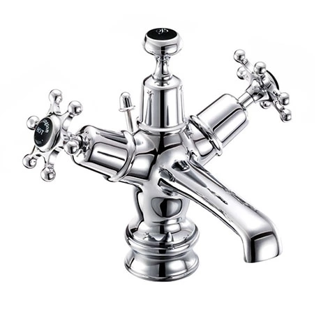 The Burlington Birkenhead Regent Black Basin Mixer is the perfect complement to Burlingtons Jet Black range. This basin mixer is constructed from brass and beautifully finished in chrome. The Regent base gives the tap a ridged, slightly taller, elegant appearance. It features traditional screw down valves and comes supplied with a pop-up waste.