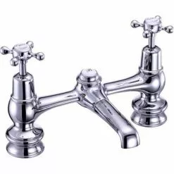 The Burlington Claremont Black Bridge Curved Spout Basin Mixer is the perfect complement to Burlington’s Jet Black range. This basin mixer is constructed from brass and beautifully finished in chrome. It features traditional screw down valves and a swivel spout with a 180Β° swivel range.