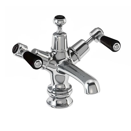 The Burlington Kensington Regent Black Basin Mixer is the perfect complement to Burlingtons Jet Black range. This basin mixer is constructed from brass and beautifully finished in chrome. The Regent base gives the tap a ridged, slightly taller, elegant appearance. It features quarter-turn valves and comes supplied with a click clack waste.