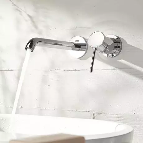 The Essence wall mounted 2-hole basin mixer has an elegant, subtle design that will be a real highlight in your bathroom. This L-Size version features a 230mm spout for maximum comfort in your daily bathroom routines. The tap features an easy to use metal lever and GROHE EcoJoy which reduces water consumption by up to 50% without compromising on performance. The spray angle of the spout can be adjusted precisely with the integrated GROHE AquaGuide.