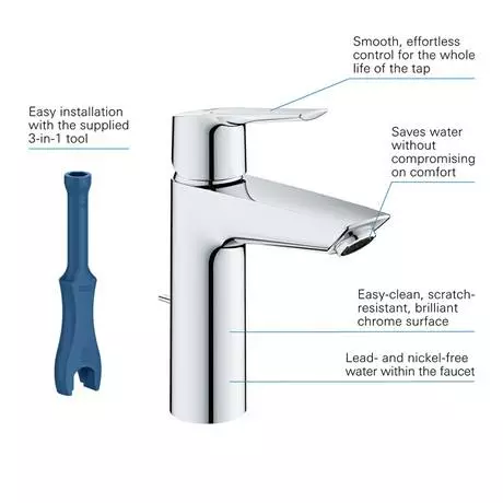 More height, more comfort and with easier than ever fitting, the new Grohe QuickFix Start basin mixer is the ideal affordable update for stylish modern bathrooms. Inside the GROHE SilkMove ceramic cartridge offers durable, precise volume and temperature control via the solid metal lever. The integrated temperature limiter saves energy, while GROHE EcoJoy reduces your water consumption to 5.7 l/min without compromising on performance. The useful pop-up waste is operated by a small rod on the back of the tap and allows easy opening and closing without getting your hands wet.