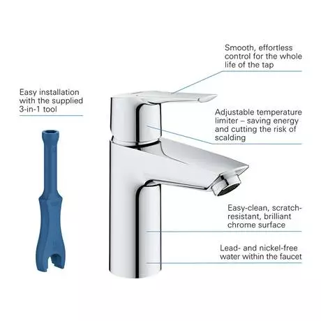 With faster than ever to installation thanks to a 3-in-1 tool, the new Grohe QuickFix Start basin mixer is perfect for upgrading to a more modern, comfortable bathroom. Inside the GROHE SilkMove ceramic cartridge offers durable, precise volume and temperature control via the solid metal lever. GROHE Zero isolated inner waterways ensure that water is lead- and nickel-free within the tap. And the GROHE QuickFix installation system with 3-in-1 tool and flexible connection hoses means it can be fitted in minutes. Suitable for low pressure systems.