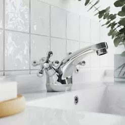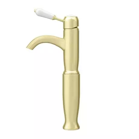 The eye-catching brushed brass Lancaster traditional tall mono basin mixer with curved spout, part of our range of traditional bathroom taps with its elegant spout design and expertly crafted white ceramic lever handle, it’s classic design will bring a touch of sophistication to your bathroom. Manufactured from solid brass with a stunning brushed finish. Single lever handle controls temperature and flow of water. Designed to be used with a counter top basin or bowl.